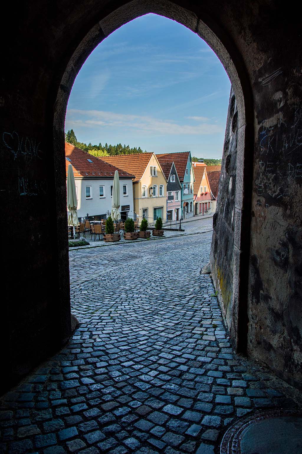 Ich überquere den Fluss über den Eisernen Steg – eine schlichte, funktionale Fußgängerbrücke, die dennoch mit ihrem Blick auf Fluss und Stadt romantische Stimmung versprüht. Durch die Rosenau geht es weiter zum Bamberger Tor, dem einzig erhaltenen Stadttor Kronachs. Es wurde im 14./15. Jahrhundert erbaut und ist ein imposantes Zeugnis spätmittelalterlicher Wehrarchitektur.
